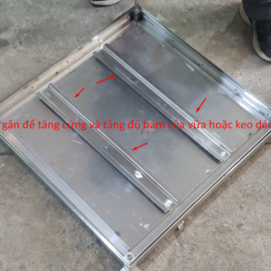 - Phần nắp chính: Có các thanh đỡ chịu lực, dùng để lát gạch lên trên hoặc làm bằng inox phẳng và gắn khóa để có thể kết nối hoặc tháo rời 2 phần của sản phẩm ra khỏi nhau. Phần nắp này thường đi kèm tai inox, bộ lục giác mở khóa, tay cầm 1 hoặc 2 cạnh bên hoặc 2 tay cầm tháo rời.